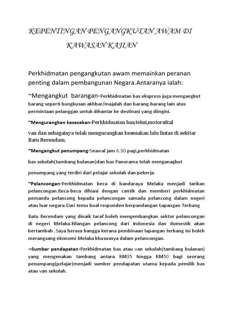 Namun begitu, masyarakat kita hari ini kurang berminat untuk menggunakan perkhidmatan ini. Fungsi utama pengangkutan awam sepatutnya memberi kemudahan kepada pengguna. Pelajar tingkatan 3 perlu menyiapkan kerja kursus yang merupakan jenis pentaksiran pelbagai instrumen yang terdapat dalam peperiksaan pt3. Sesiapa sahaja boleh dijangkiti dan menyebarkan penyakit ini kepada orang lain. Rangkaian jalan raya malaysia sangat besar, merangkumi 63,445 km, termasuk 1,630 km lebuh raya.